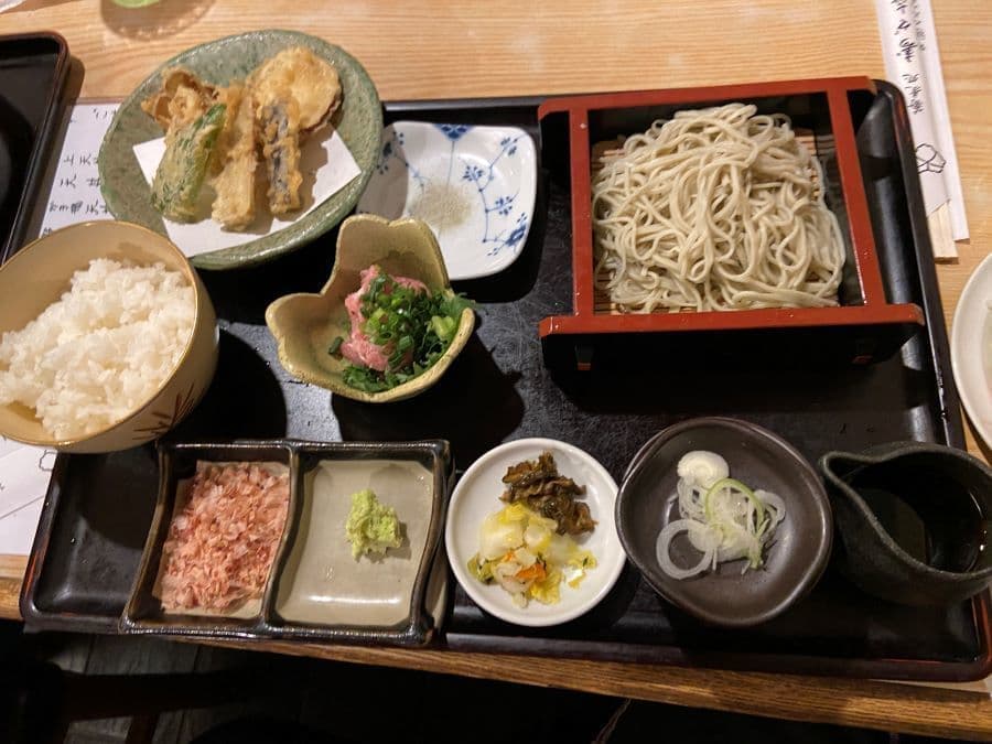 旨いそばを前に友人はお酒を(ドライバーの小生はじっとがまん)、つまみは前菜盛り合わせ。季節限定の天ぷら、にしんの山椒漬け、最後に珈琲も頂き大満足となりました。