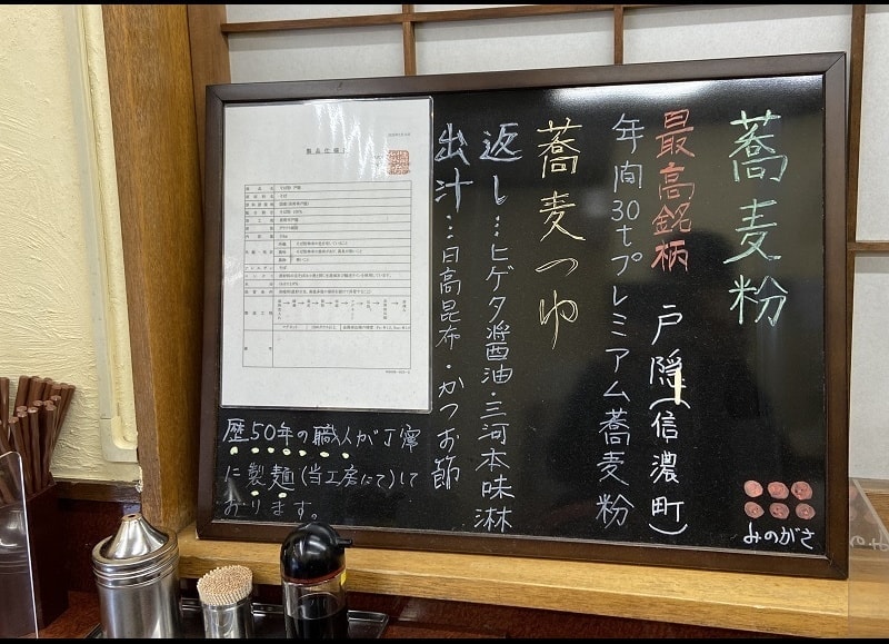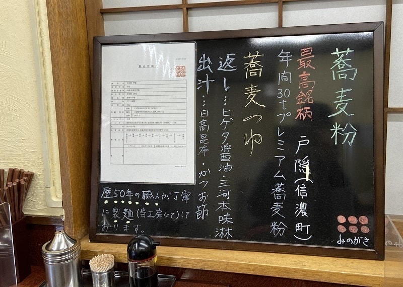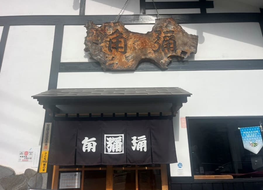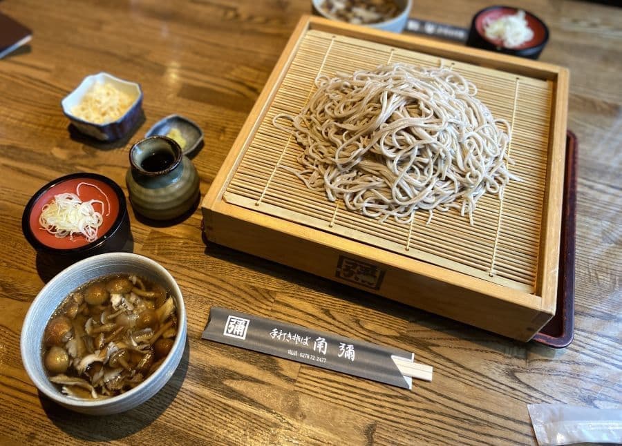弥彦山の「弥」の字を取り「角弥」と命名されたともいいますが、戦後、群馬県水上町湯檜曽にて営業を続けている伝統店です。なお、同店の「へぎそば」にはふのりは入っていにとのことでした。