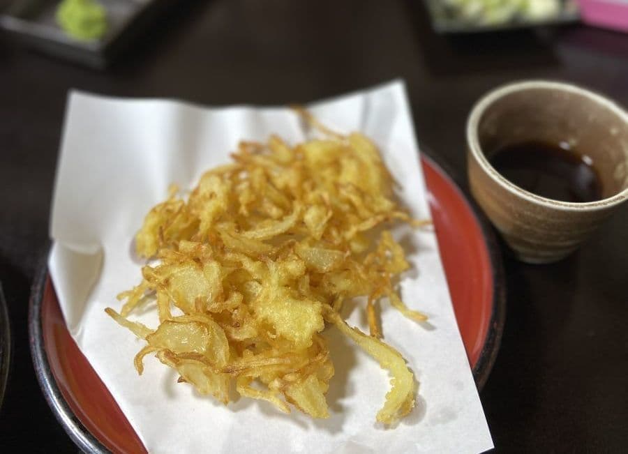 注文したのは春菊天そば(冷たい)ですが出汁が関東風の黒目で味はやや甘めの出汁です。